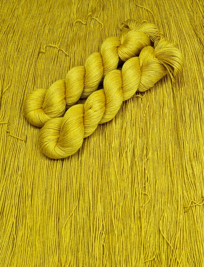 Sun Yellow is a deep, rich yellow semisolid colorway, and it appears beautifully on this base, shining as gold.
