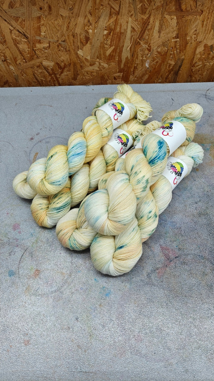 Dette produkt er et fed af ca. 100 gram håndfarvet garn | 75% SW Merino, 25% Nylon | 4 Ply Sock | 425m / 100g
