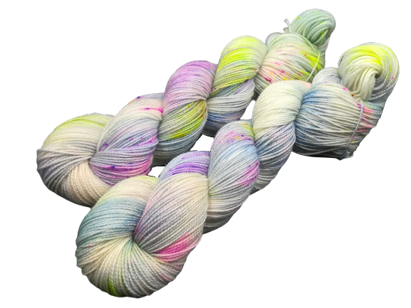 Sweet Dreams (are made of this ....) This colorway is simply so wonderfully delicate in its pastel blue, green, pink, and purple colors and then it just has a twist of neon yellow, purple, and pink speckles.